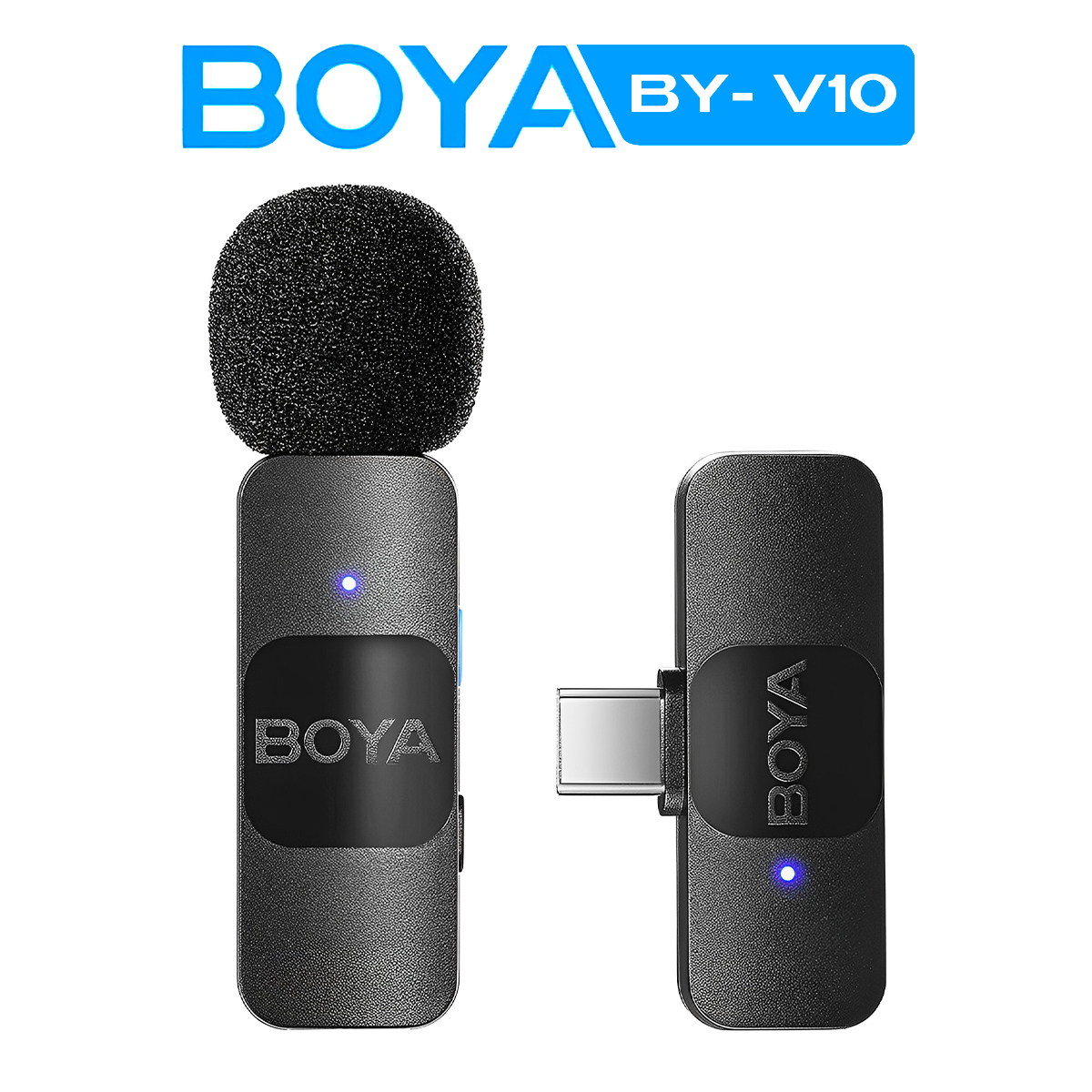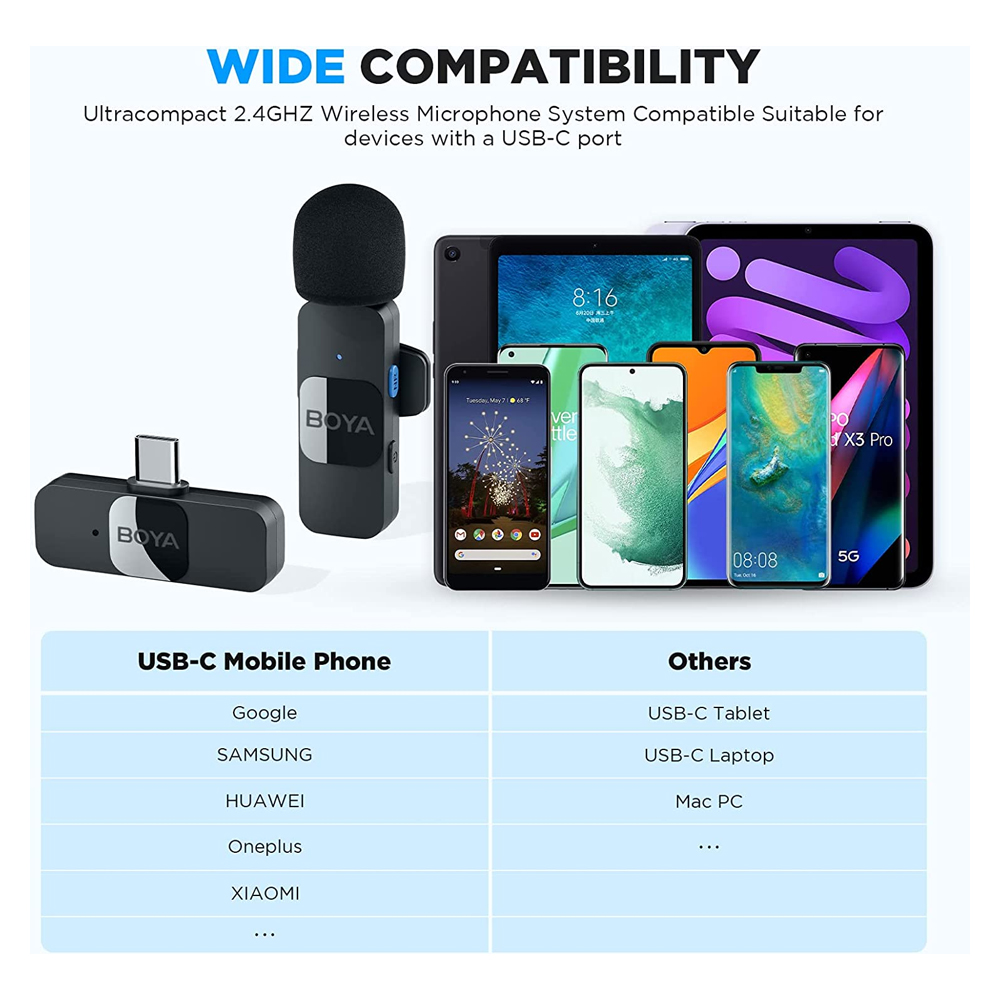 USB-C Compatibility: The Boya By-V10 wireless microphone is designed for USB-C devices, ensuring versatility and ease of use on smartphones, tablets and compatible cameras, improving their audio recordings and creative projects;